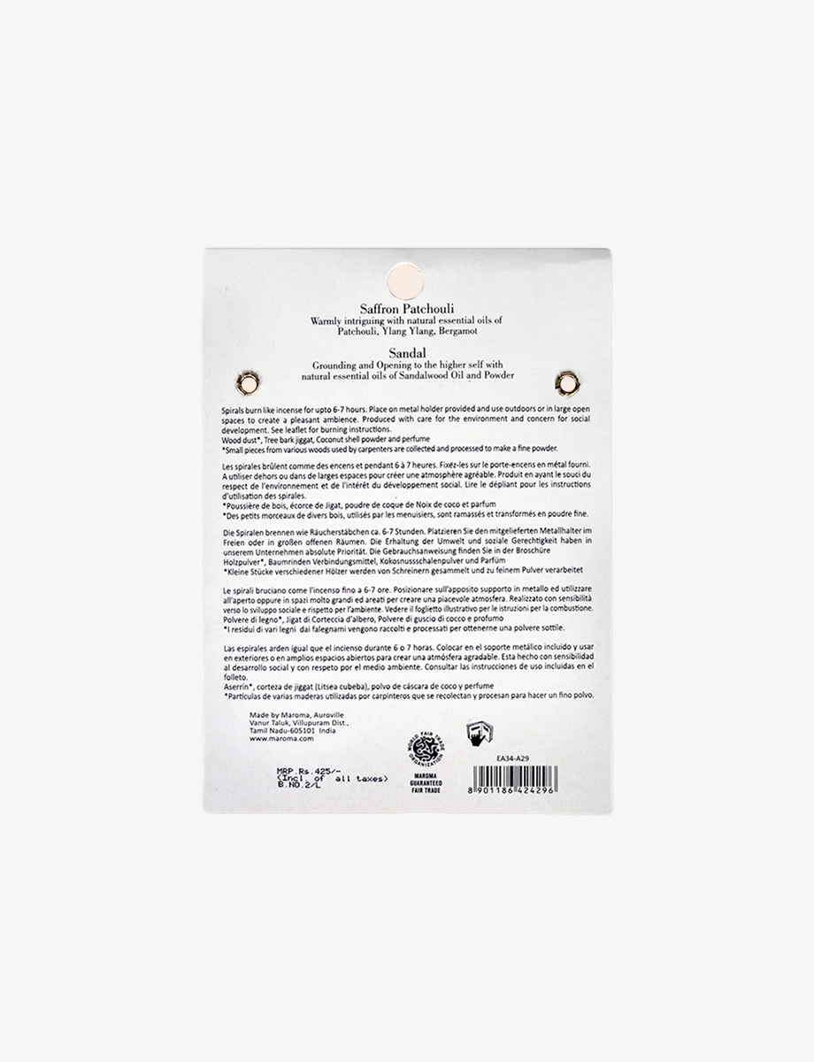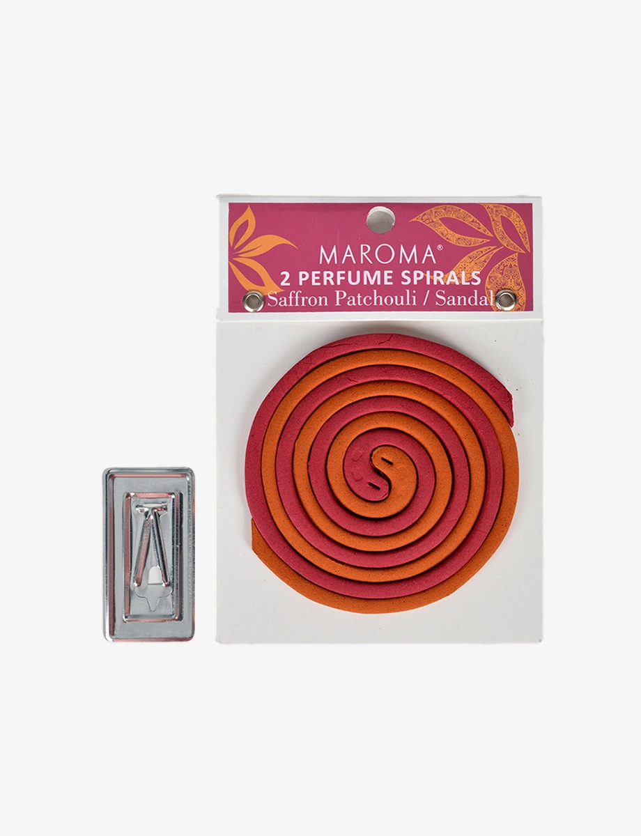 Luxuriously earthy saffron patchouli and soothing sandalwood—two separate spirals, each burning 6–7 hours. Perfect for creating a warm, calming atmosphere, enhancing meditation, or deepening relaxation. Comes with a metal stand for easy use. Gently separate the coils before lighting.