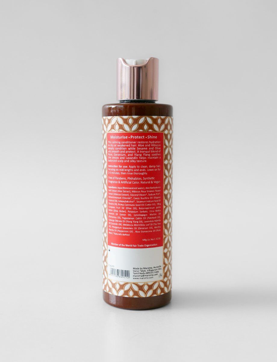 A calming, restorative conditioner for dry or weakened hair. Aloe Vera and Hibiscus deeply hydrate and soften, while Sesame and Olive oils smooth, protect, and enhance shine. A tranquil blend of Rose, Geranium, Ylang Ylang, and Lavandin essential oils soothes the senses, promoting a balanced scalp and silky, nourished hair.