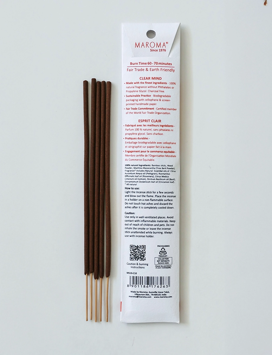 A fresh, stimulating blend of petitgrain, rosemary, lemon, basil, and cinnamon leaf to promote mental clarity and focus. Rosemary and basil help sharpen concentration, while petitgrain and lemon provide a crisp, refreshing lift. A touch of cinnamon leaf adds warmth, enhancing alertness and motivation. Perfect for work, study, or moments that call for clear thinking. Hand-rolled with wood powder and natural gum resin, made with 100% natural fragrance and pure essential oils—free from phthalates, propylene glycol, and charcoal for a clean, pure burn. Packaged in biodegradable cellophane and screen-printed handmade paper. Aroma benefits: Focus-enhancing, refreshing, mentally clarifying. Burn time: 60-70 minutes per stick.
