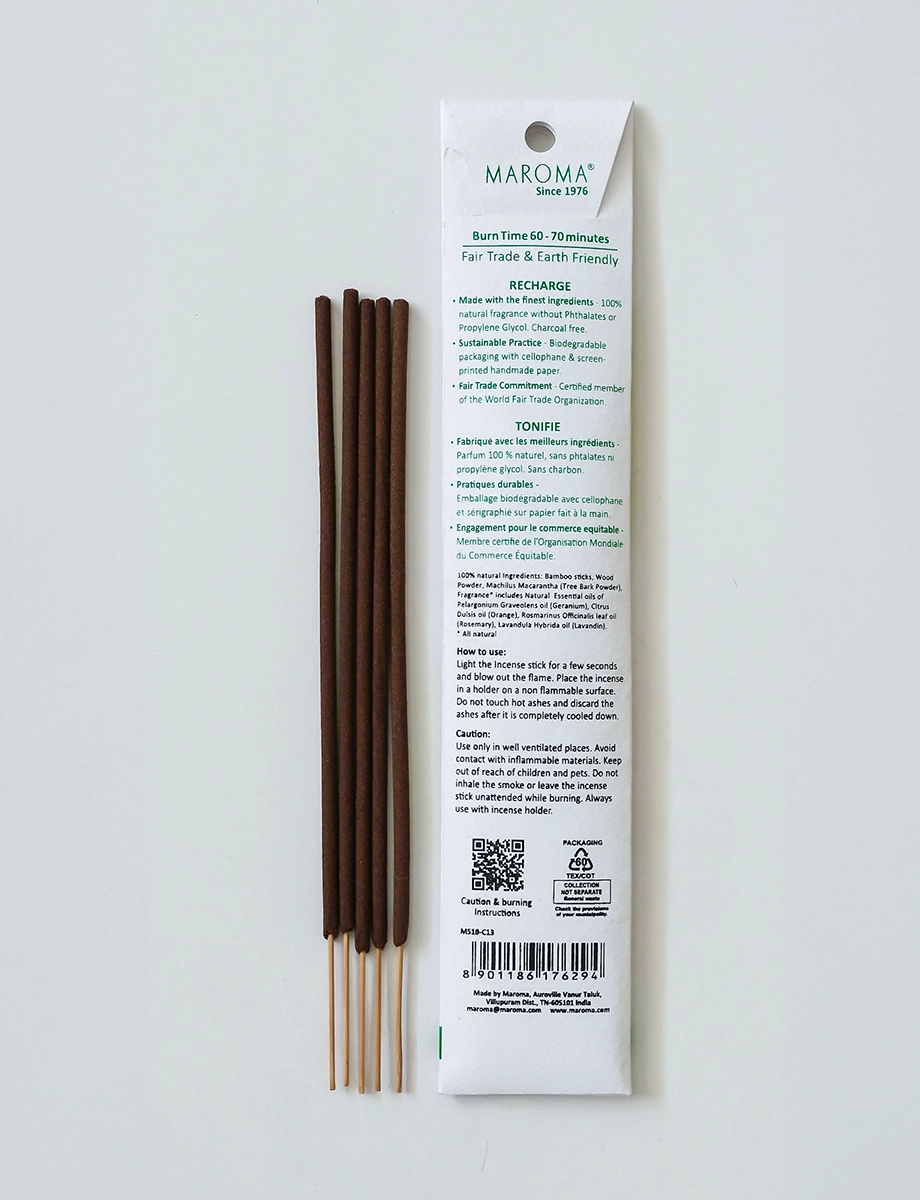 A revitalising blend of geranium, orange, rosemary, and lavandin to restore energy and sharpen focus. Geranium and orange uplift the mood, while rosemary and lavandin clear the mind and enhance concentration. Ideal for a mid-day reset or whenever you need a boost. Hand-rolled with wood powder and natural gum resin, made with 100% natural fragrance and pure essential oils—free from phthalates, propylene glycol, and charcoal for a clean, pure burn. Packaged in biodegradable cellophane and screen-printed handmade paper. Aroma benefits: Energizing, clarifying, mood-boosting. Burn time: 60-70 minutes per stick.
