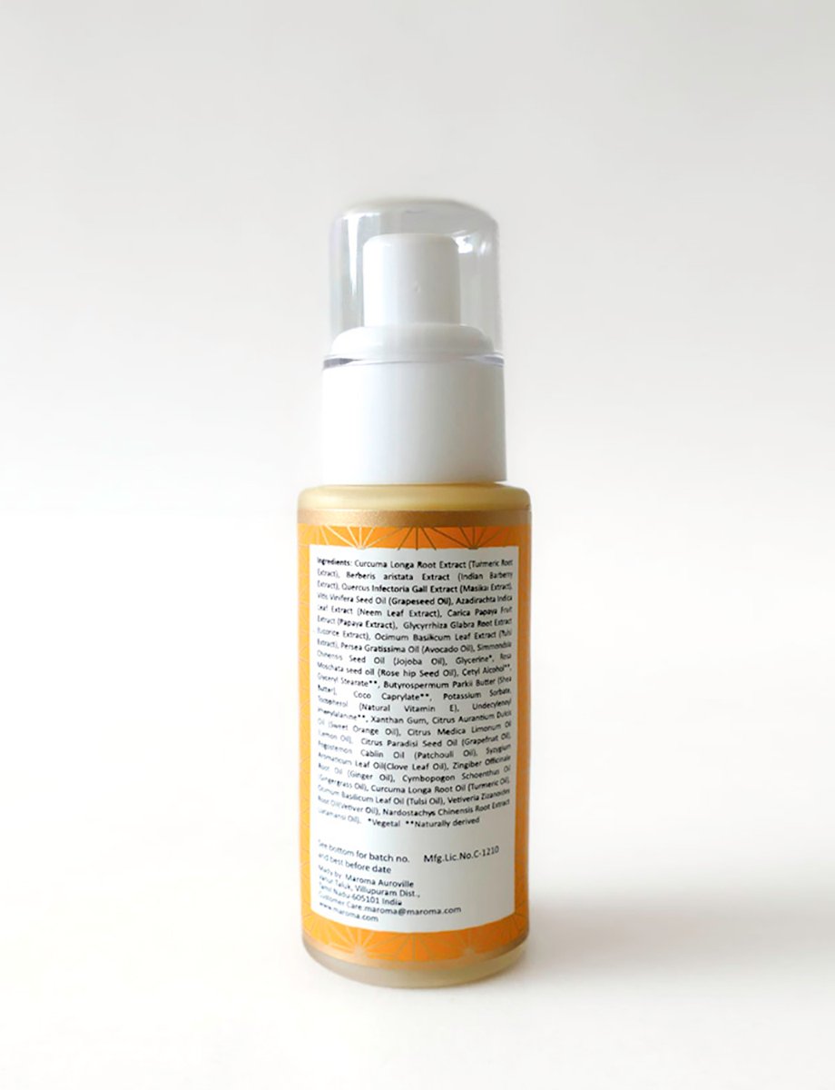 Turmeric Root Extract, Masikai Extract, Indian Barberry Extract, Licorice Extract, Neem Leaf Extract, Tulsi Extract, Grapeseed Oil, Jojoba Oil, Avocado Oil, Rosehip Seed Oil, Shea Butter, Pomegranate Extract, Cucumber Extract, Vitamin E (Natural), Sweet Orange Oil, Lemon Oil, Grapefruit Oil, Patchouli Oil, Clove Leaf Oil, Ginger Oil, Gingergrass Oil, Turmeric Oil, Tulsi Oil, Vetiver Oil, Jatamansi Oil.