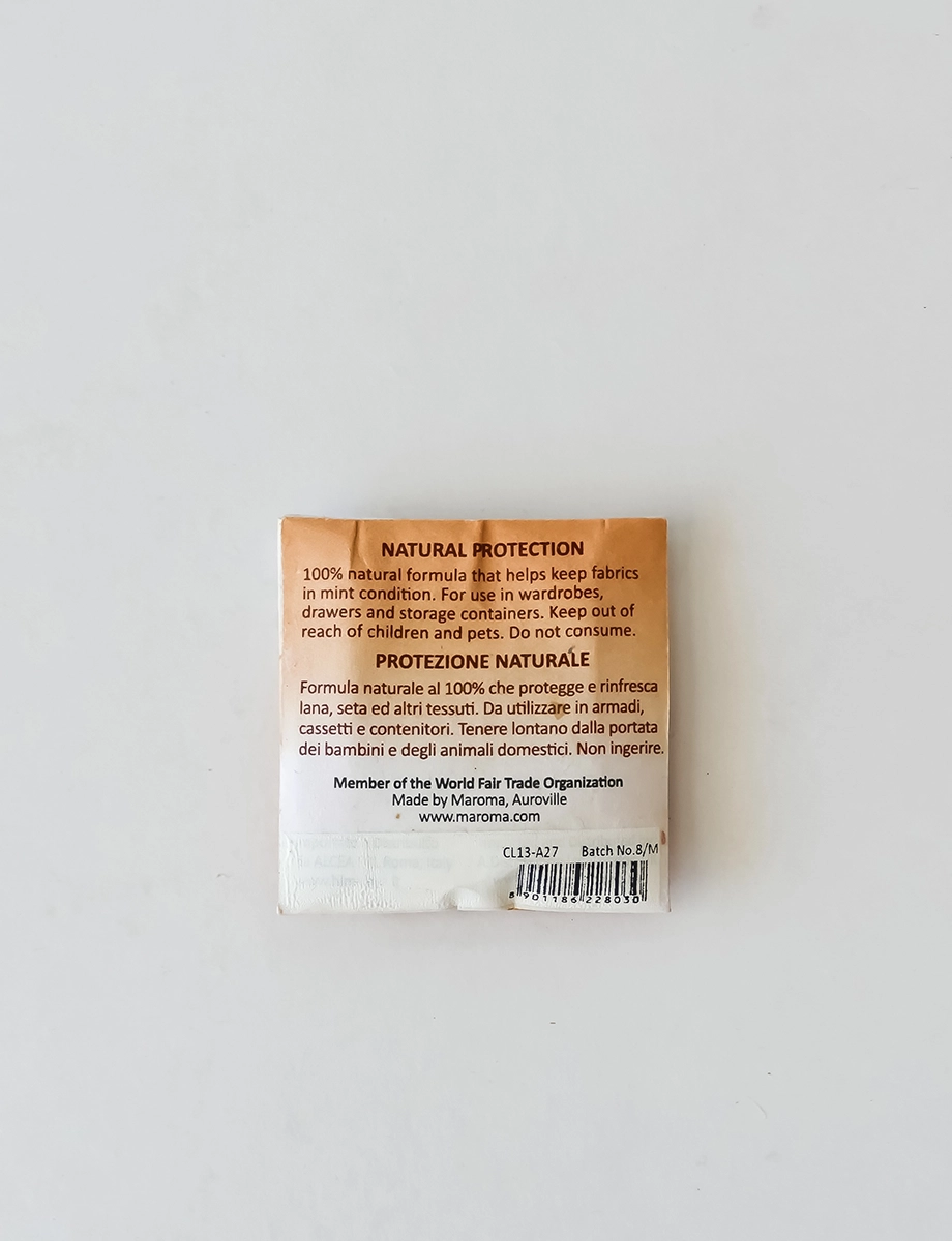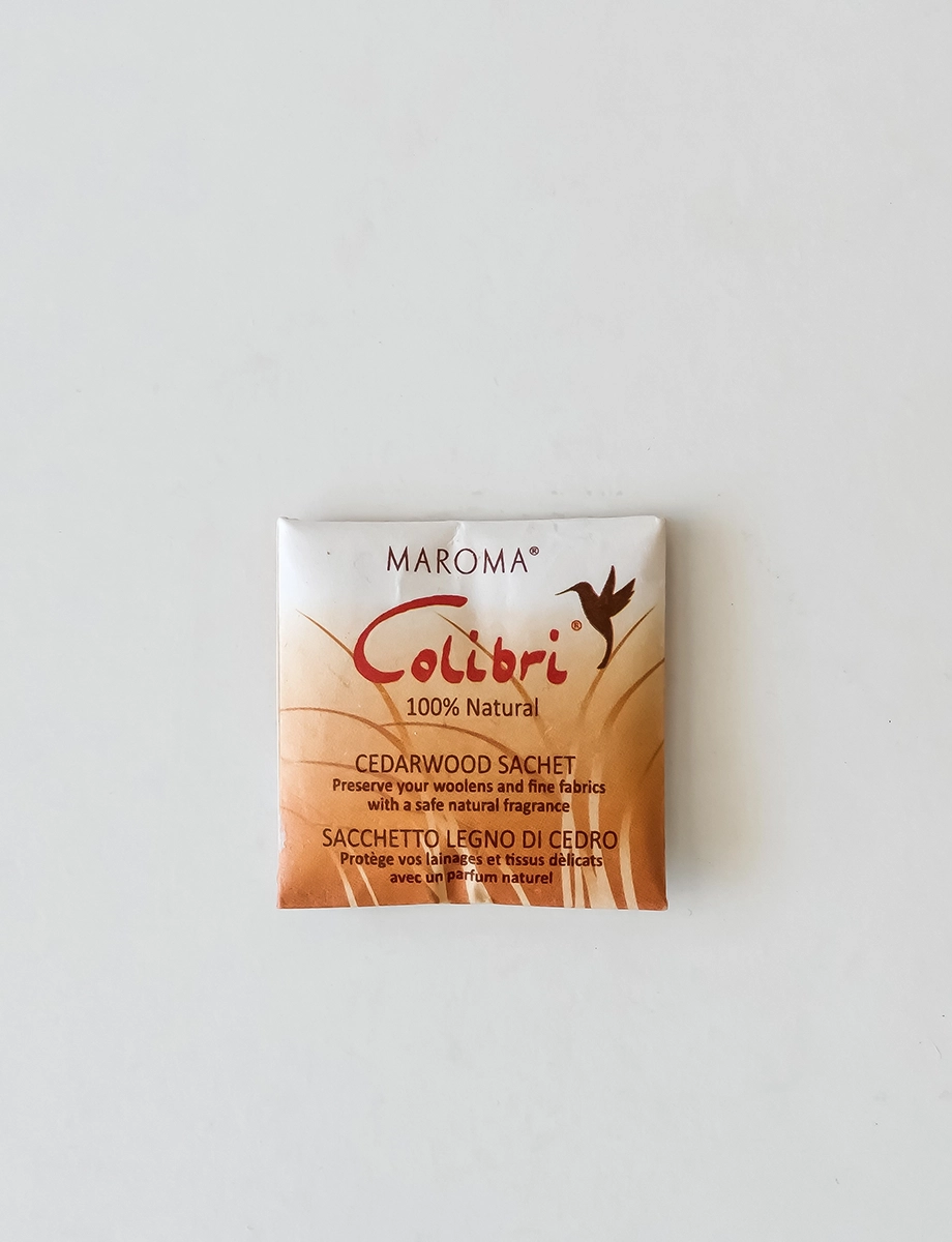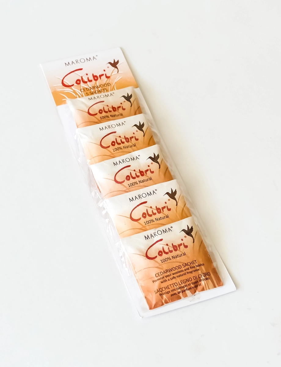Colibri Cedarwood Sachets create a secure cocoon of natural aromatics which will keep wool, silk and other fabrics in mint condition. Colibri’s natural formula, which was developed by Maroma for use in closets and other storage areas, freshens and preserves with light, clean natural fragrances and also has anti-odor properties related to tobacco and mildew. Packed in handmade paper. Packed by 5.