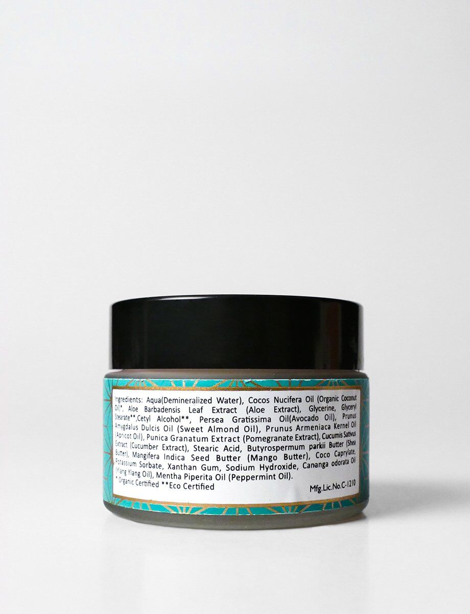 Aqua (Demineralized Water), Cocos Nucifera Oil (Organic Coconut Oil)*, Aloe Barbadensis Leaf Extract (Aloe Extract), Glycerine, Glyceryl Stearate**, Cetyl Alcohol**, Persea Gratissima Oil (Avocado Oil), Prunus Amygdalus Dulcis Oil (Sweet Almond Oil), Prunus Armeniaca Kernel Oil (Apricot Oil), Punica Granatum Extract (Pomegranate Extract), Cucumis Sativus Extract (Cucumber Extract), Stearic Acid, Butyrospermum Parkii Butter (Shea Butter), Mangifera Indica Seed Butter (Mango Butter), Coco Caprylate, Potassium Sorbate, Xanthan Gum, Sodium Hydroxide, Cananga Odorata Oil (Ylang Ylang Oil), Mentha Piperita Oil (Peppermint Oil). *Organic Certified **Eco Certified.