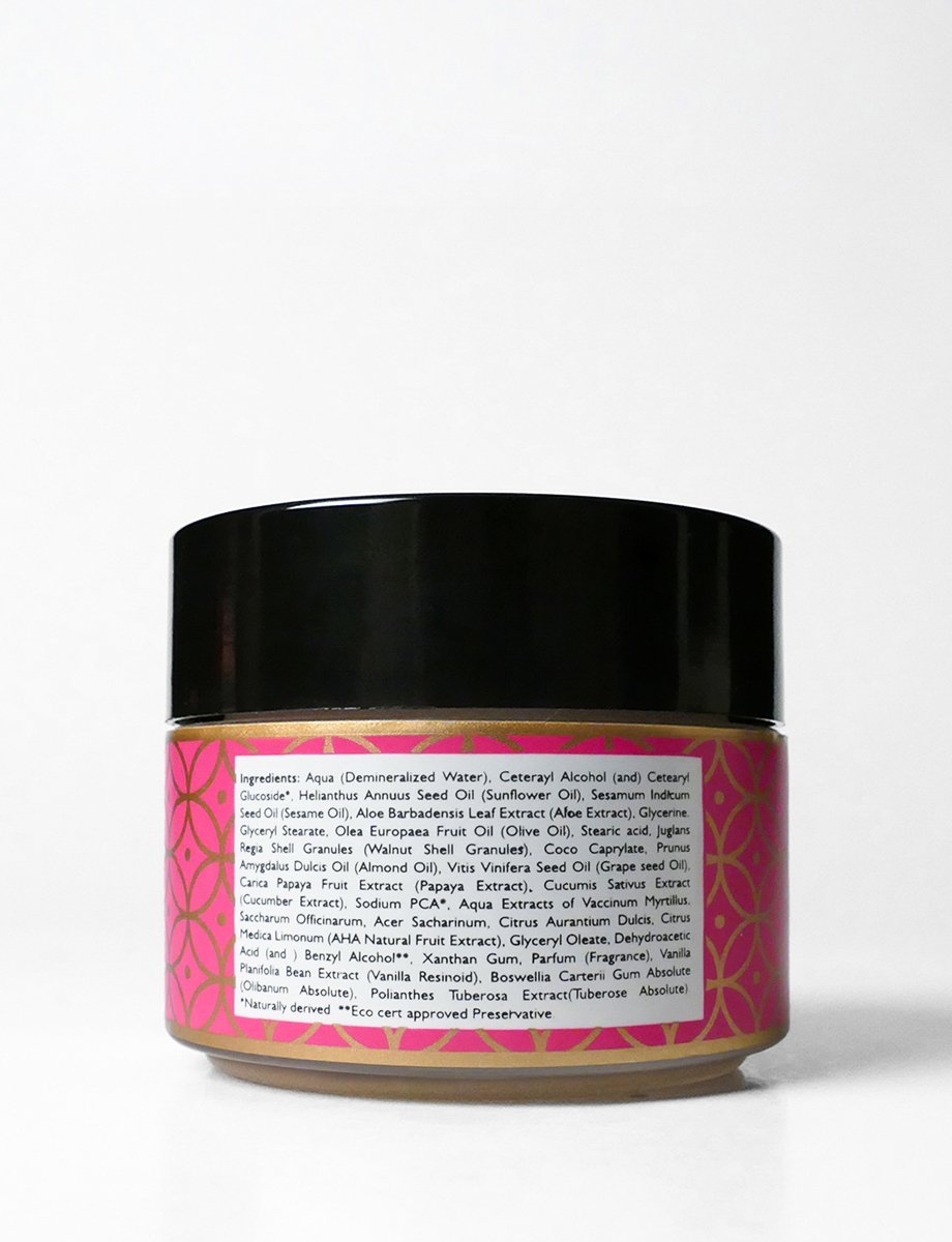 Aqua (Demineralized Water), Ceterayl Alcohol (and) Cetearyl Glucoside*, Helianthus Annuus Seed Oil (Sunflower Oil), Sesamum Indicum Seed Oil (Sesame Oil), Aloe Barbadensis Leaf Extract (Aloe Extract), Glycerine, Glyceryl Stearate, Olea Europaea Fruit Oil (Olive Oil), Stearic acid, Juglans Regia Shell Granules (Walnut Shell Granules), Coco Caprylate, Prunus Amygdalus Dulcis Oil (Almond Oil), Vitis Vinifera Seed Oil (Grape seed Oil), Carica Papaya Fruit Extract (Papaya Extract), Cucumis Sativus Extract (Cucumber Extract), Sodium PCA*, Aqua Extracts of Vaccinum Myrtillus, Saccharum Officinarum, Acer Sacharinum, Citrus Aurantium Dulcis, Citrus Medica Limonum (AHA Natural Fruit Extract), Glyceryl Oleate, Dehydroacetic Acid (and ) Benzyl Alcohol**, Xanthan Gum, Parfum (Fragrance), Vanilla Planifolia Bean Extract (Vanilla Resinoid), Boswellia Carterii Gum Absolute (Olibanum Absolute), Polianthes Tuberosa Extract (Tuberose Absolute). *Naturally derived, **Eco cert approved Preservative.