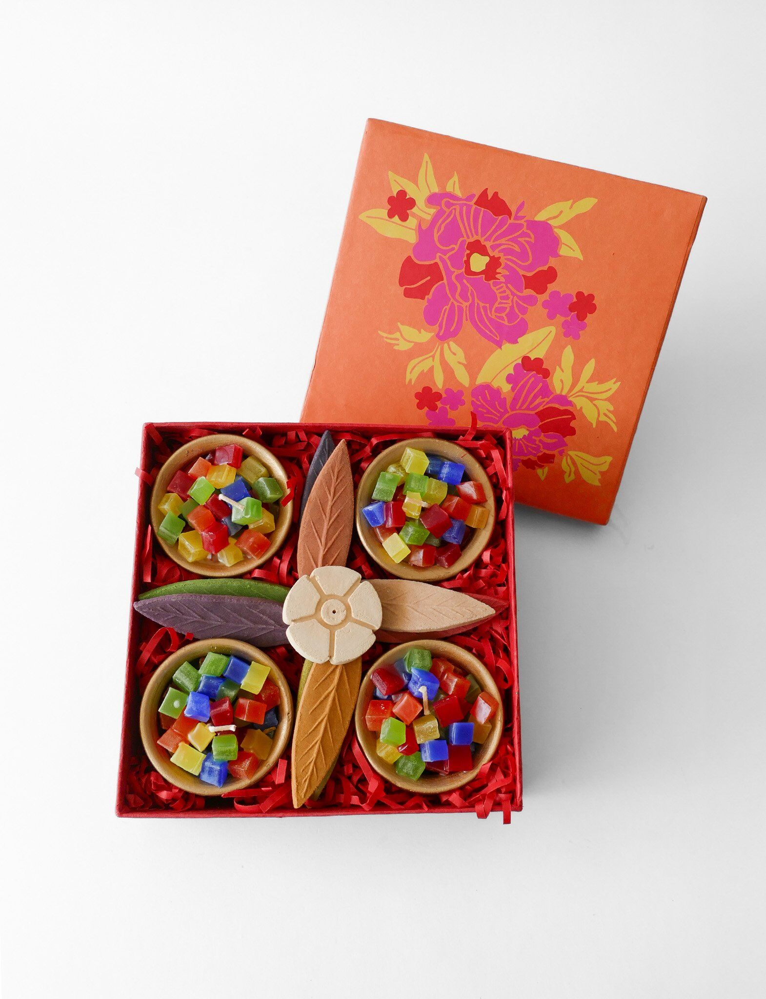 Celebrate togetherness with the Festival Harmony Gift Set, crafted to bring balance and joy to your festivities. Featuring four uniquely designed terracotta diyas adorned with gold, eight incense leaves, and an incense holder, it pairs luminous tradition with the soothing presence of natural fragrance. A harmonious blend of light, color, and aroma — perfect for gatherings, rituals, and creating cherished festive moments.