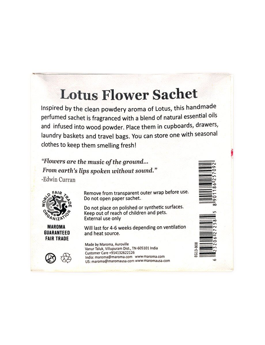 Inspired by the fresh floral notes of Lotus, this handmade perfumed sachet is fragranced with a blend of natural essential oils and infused into wood powder. For drawers, closets, cars, shelves, suitcases or between linens.