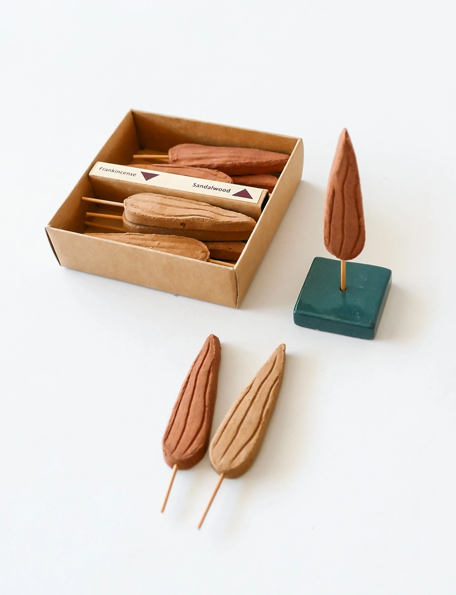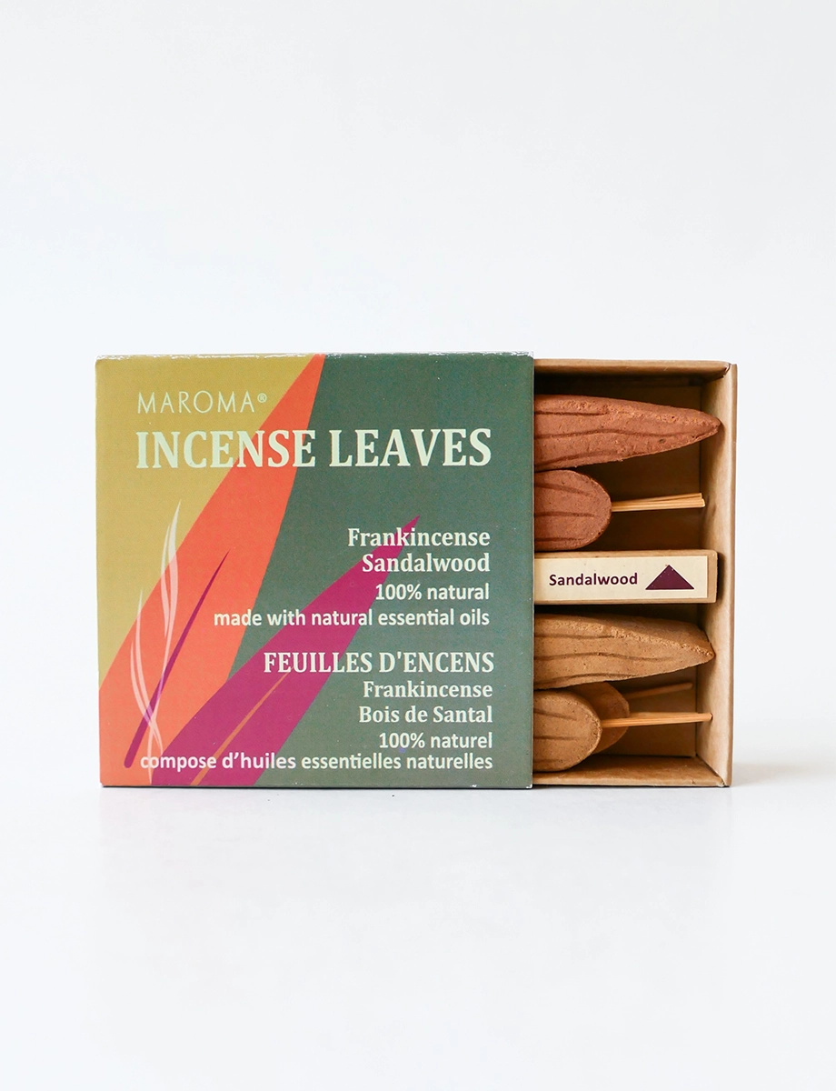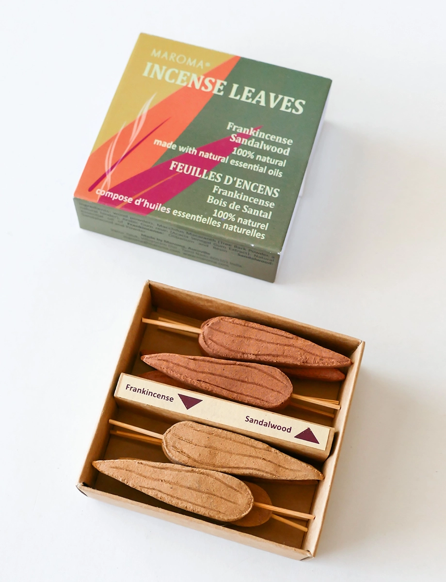 Shaped like delicate leaves, these incense pieces offer a refined alternative to traditional cones. Each box contains 12 incense leaves—6 infused with the rich, resinous scent of frankincense and 6 with the warm, woody essence of sandalwood. Together, they create a deeply grounding and meditative atmosphere, perfect for reflection, relaxation, or spiritual rituals.