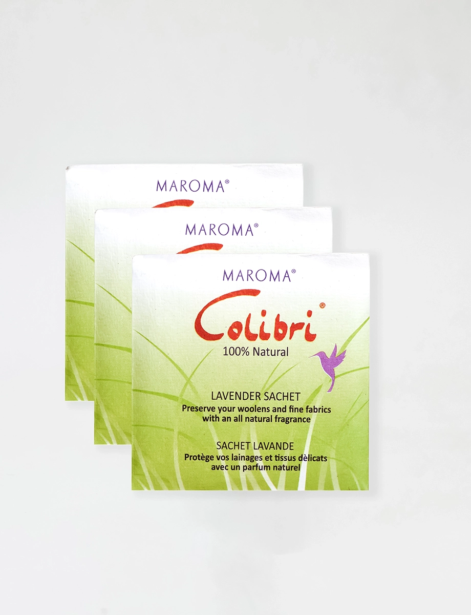 Colibri Lavender Sachets create a secure cocoon of natural aromatics which will keep wool, silk and other fabrics in mint condition. Colibri’s natural formula, which was developed by Maroma for use in closets and other storage areas, freshens and preserves with light, clean natural fragrances and also has anti-odor properties related to tobacco and mildew. Packed in handmade paper. Packed by 3