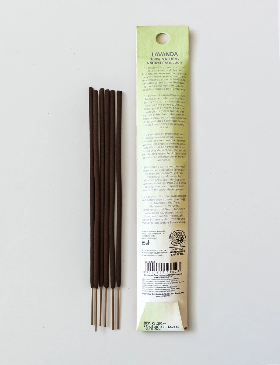 The calming scent of lavender meets the crispness of eucalyptus, tea tree, and vetiver, creating a serene yet refreshing atmosphere. Free from charcoal, phthalates, and toxic ingredients, these natural incense sticks offer a clean burn while their botanical blend helps keep mosquitoes at bay—perfect for peaceful evenings indoors or out.