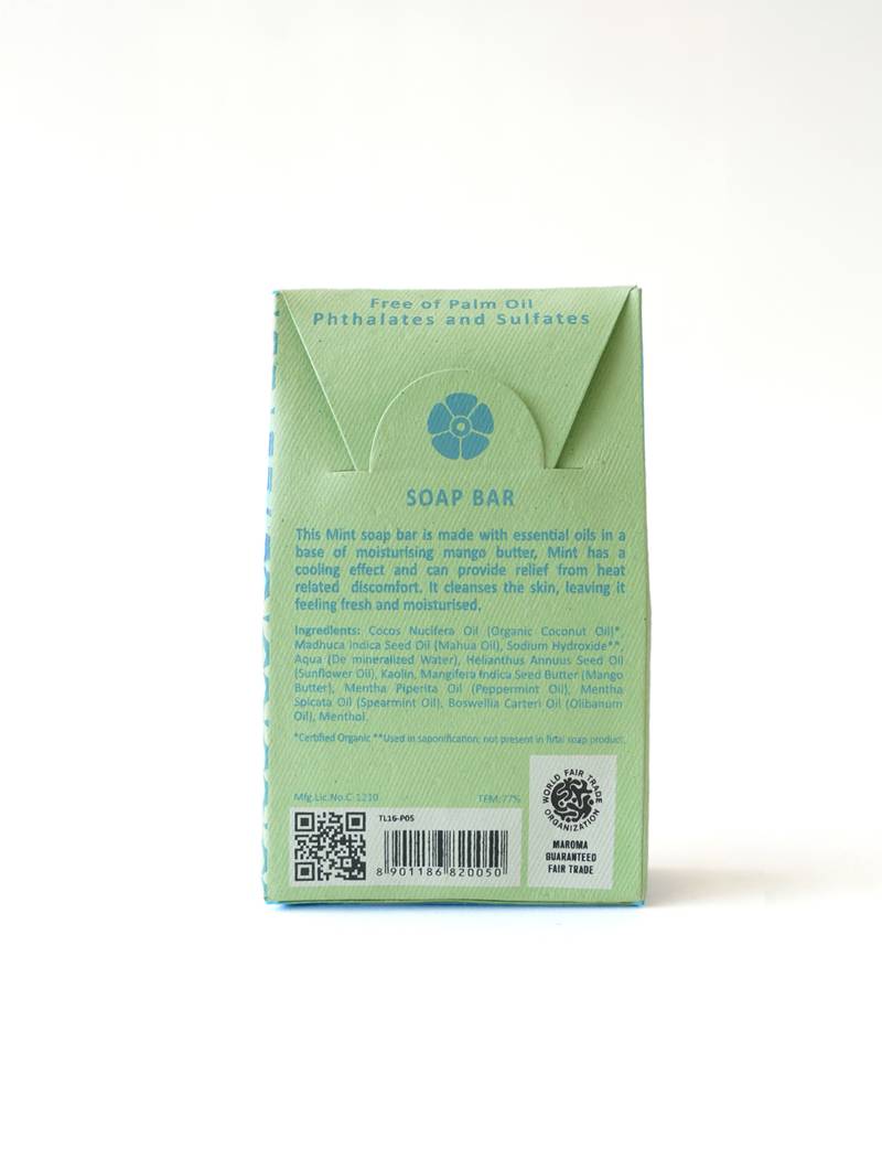 Cocos Nucifera Oil (Organic Coconut Oil)*, Madhuca Indica Seed Oil (Mahua Oil), Sodium Hydroxide**, Aqua (De mineralized Water), Melianthus Annuus Seed Oil (Sunflower Oil), Kaolin, Mangifera Indica Seed Butter (Mango Butter), Mentha Piperita Oil (Peppermint Oil), Mentha Spicata Oil (Spearmint Oil), Boswellia Carteri Oil (Olibanum Oil), Menthol. *Certified Organic **Used in saponification; not present in final soap product.