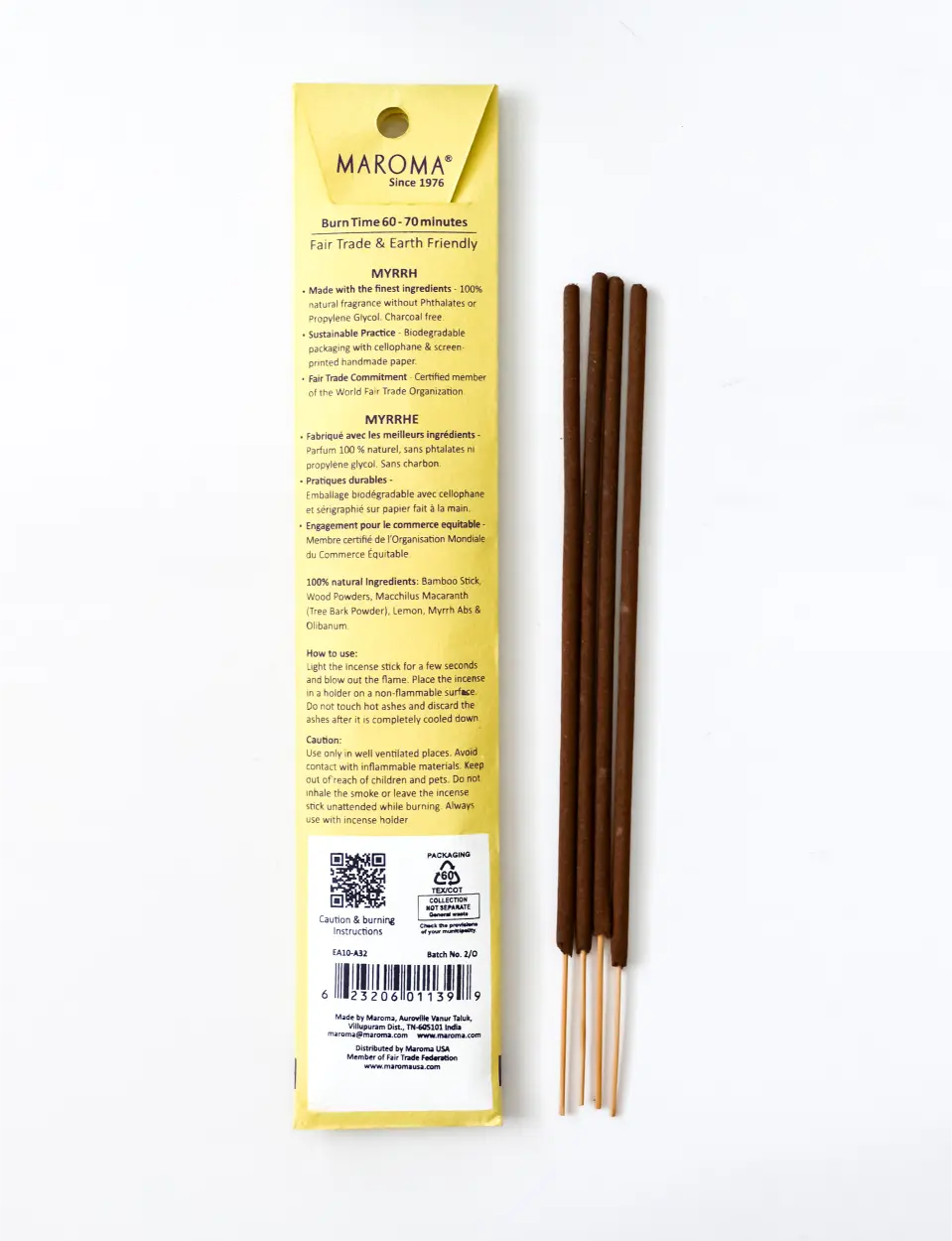 - A timeless blend of rich myrrh absolute, bright lemon, and sacred olibanum—creating a deep, grounding aroma with a touch of fresh citrus. Warm and meditative, this scent has been cherished for centuries for its calming and purifying qualities. Each 8″ incense stick is handcrafted in-house with wood powder and natural gum resin, completely free from charcoal for a clean and natural burn. Infused with our proprietary fragrance, blended with pure essential oils, it fills your space with a serene and restorative scent.