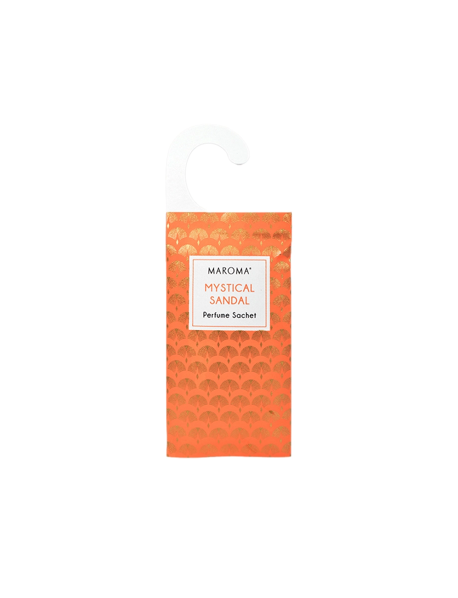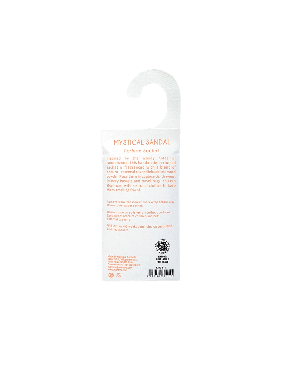 Warm and grounding, Mystic Sandal carries the rich, woody aroma of sandalwood. Infused with natural essential oils in wood powder, this hanging sachet slips easily into closets and wardrobes to keep your storage spaces serene and fresh.