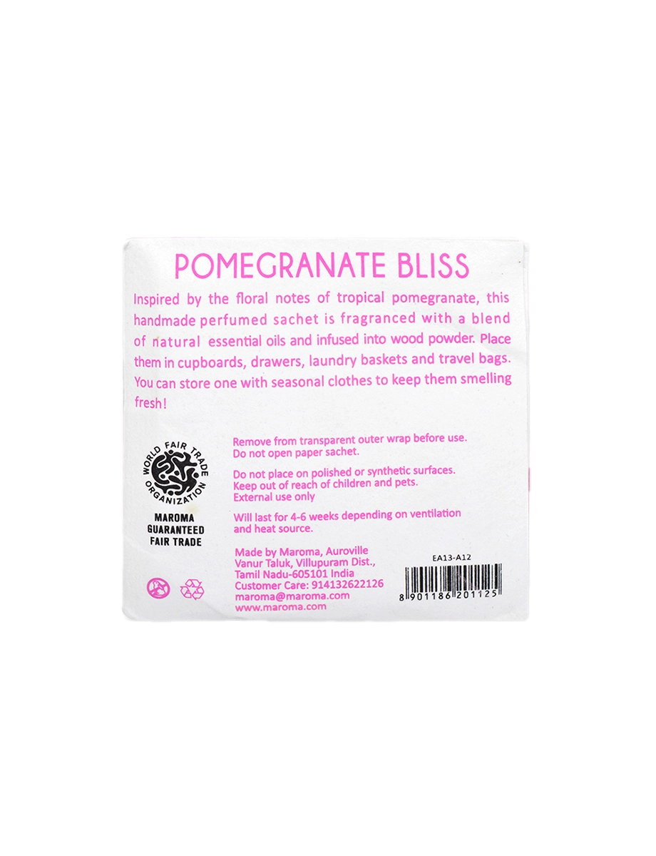Juicy and uplifting, Pomegranate Bliss bursts with the vibrant scent of tropical pomegranate. Handmade with natural essential oils infused into wood powder, this perfumed sachet is perfect for cupboards, laundry baskets, and suitcases, keeping everything fresh and lightly fragranced.