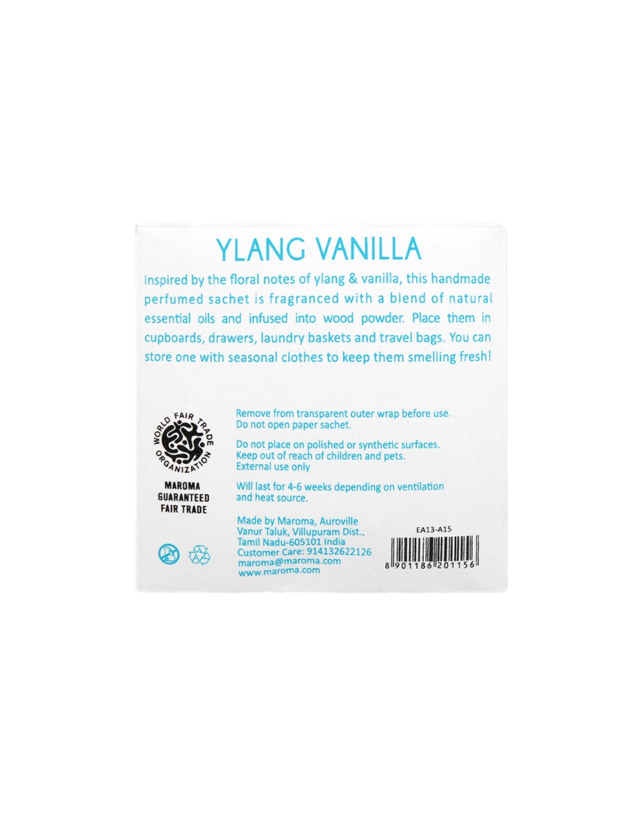 Rich and comforting, Ylang Vanilla blends exotic floral warmth with soft, creamy sweetness. Handmade and infused with natural essential oils in wood powder, this perfumed sachet brings a gentle, inviting fragrance to cupboards, clothing storage, and travel bags.