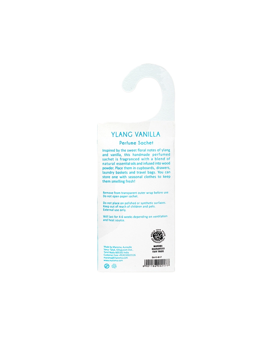 Rich and comforting, Ylang Vanilla blends exotic floral warmth with creamy sweetness. Infused with natural essential oils in wood powder, this hanging sachet gently perfumes wardrobes and storage spaces.