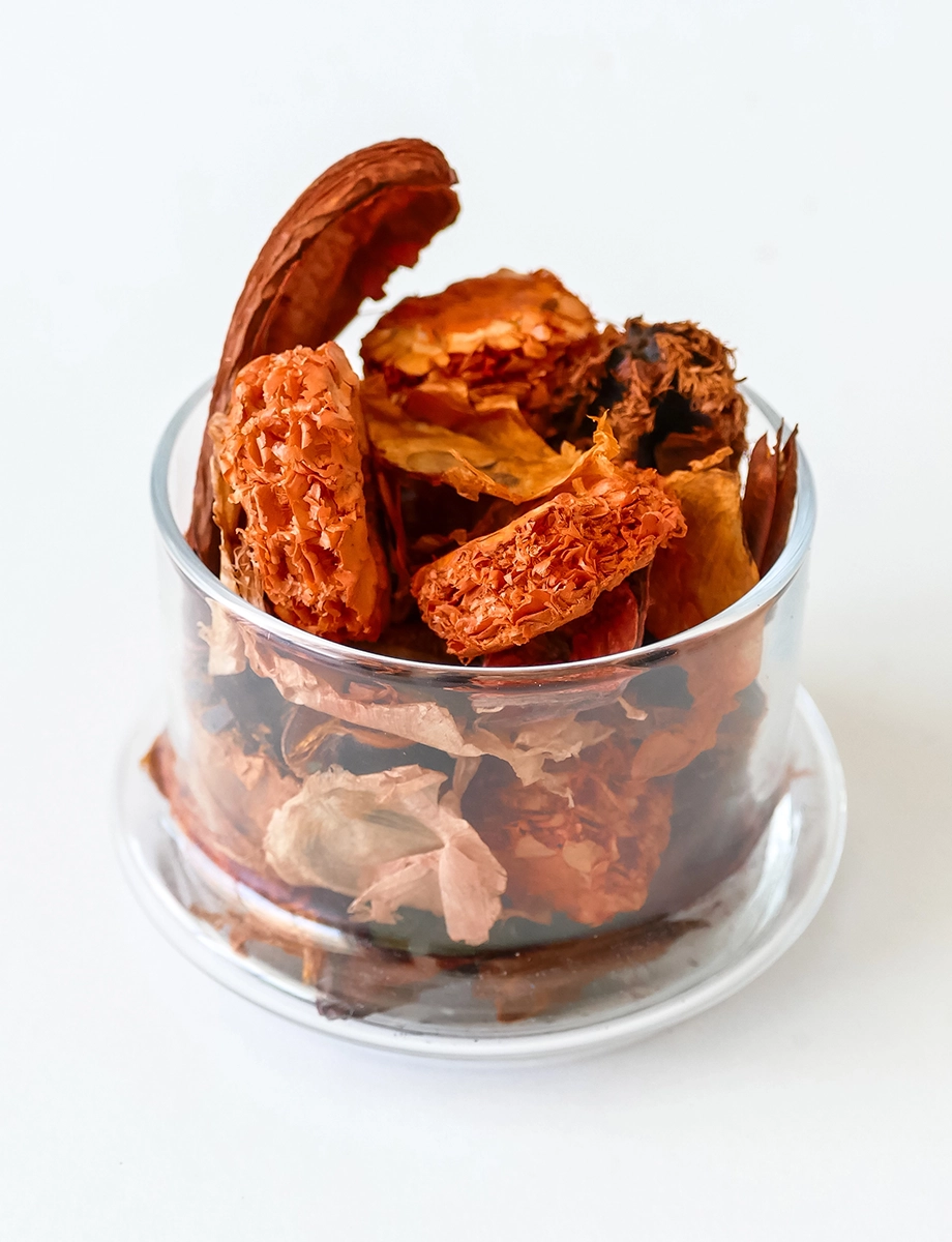 Potpourri created specially to bring Nature closer to our hearts with a rich treasure trove of colors, textures and fragrances. A delightful collection of nature’s gifts – seeds, pods, flowers and leaves, blended together with carefully chosen fine and wonderful fragrances which are mixed with natural essential oils. A unique way to add a touch of natural splendour to homes and interiors.