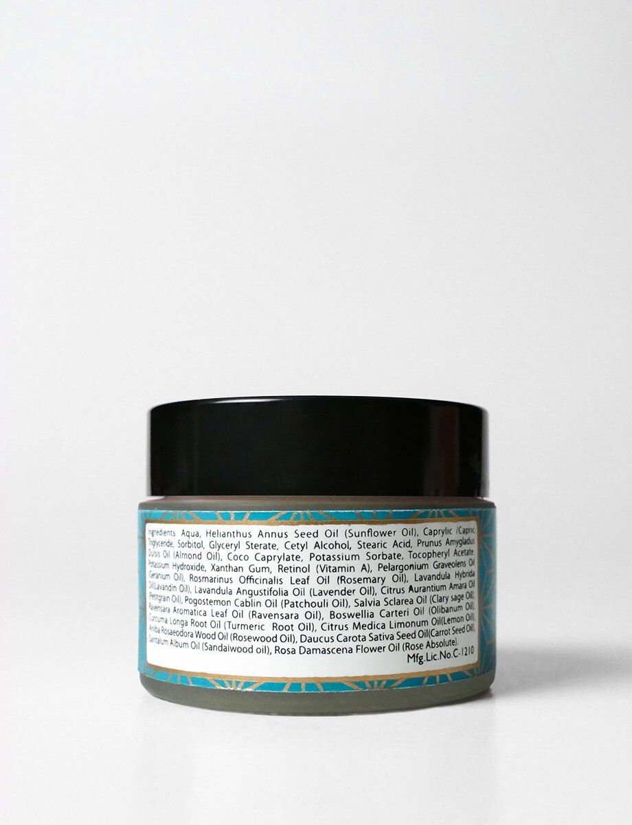 Aqua, Helianthus Annus Seed Oil (Sunflower Oil), Caprylic/Capric Triglyceride, Sorbitol*, Glyceryl Stearate**, Cetyl Alcohol, Stearic Acid, Prunus Amygdalus Dulcis Oil (Almond Oil), Coco Caprylate, Potassium Sorbate*, Tocopheryl Acetate*, Potassium Hydroxide, Xanthan Gum, Retinol (Vitamin A), Pelargonium Graveolens Oil (Geranium Oil), Rosmarinus Officinalis Leaf Oil (Rosemary Oil), Lavandula Hybrida Oil (Lavandin Oil), Lavandula Angustifolia Oil (Lavender Oil), Citrus Aurantium Amara Oil (Petitgrain Oil), Pogostemon Cablin Oil (Patchouli Oil), Salvia Sclarea Oil (Clary Sage Oil), Ravensara Aromatica Leaf Oil (Ravensara Oil), Boswellia Carteri Oil (Olibanum Oil), Curcuma Longa Root Oil (Turmeric Root Oil), Citrus Medica Limonum Oil (Lemon Oil), Aniba Rosaeodora Wood Oil (Rosewood Oil), Daucus Carota Sativa Seed Oil (Carrot Seed Oil), Santalum Album Oil (Sandalwood Oil), Rosa Damascena Flower Oil (Rose Absolute). *Vegetal **Naturally derived