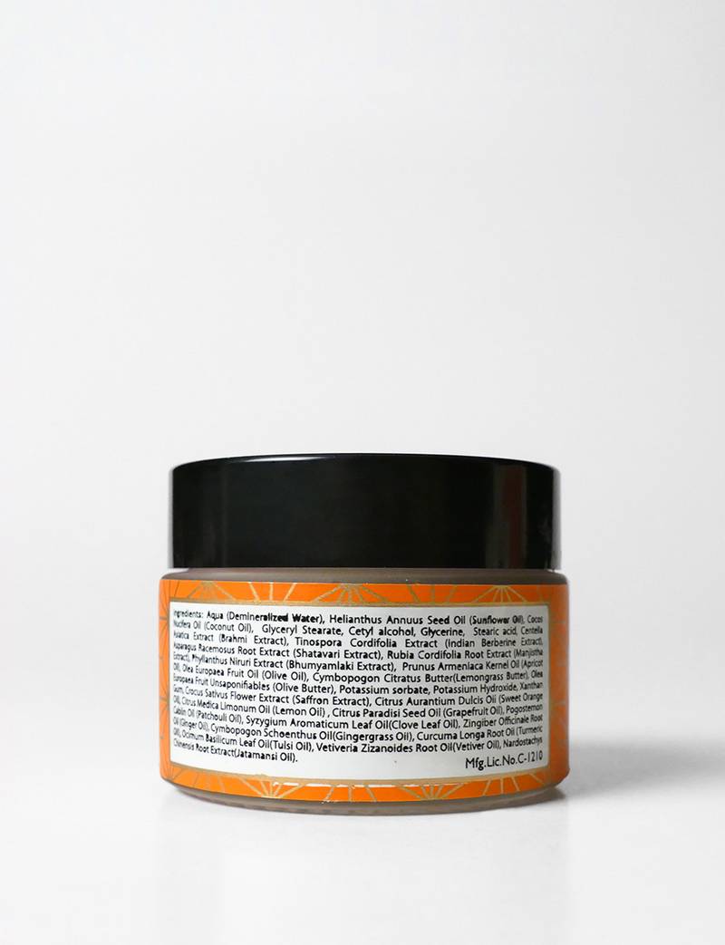 Aqua (Demineralized Water), Helianthus Annuus Seed Oil (Sunflower Oil), Cocos Nucifera Oil (Coconut Oil), Glyceryl Stearate, Cetyl Alcohol, Glycerine, Stearic Acid, Centella Asiatica Extract (Brahmi Extract), Tinospora Cordifolia Extract (Indian Berberine Extract), Asparagus Racemosus Root Extract (Shatavari Extract), Rubia Cordifolia Root Extract (Manjistha Extract), Phyllanthus Niruri Extract (Bhumyamlaki Extract), Prunus Armeniaca Kernel Oil (Apricot Oil), Olea Europaea Fruit Oil (Olive Oil), Cymbopogon Citratus Butter (Lemongrass Butter), Olea Europaea Fruit Unsaponifiables (Olive Butter), Potassium Sorbate, Potassium Hydroxide, Xanthan Gum, Crocus Sativus Flower Extract (Saffron Extract), Citrus Aurantium Dulcis Oil (Sweet Orange Oil), Citrus Medica Limonum Oil (Lemon Oil), Citrus Paradisi Seed Oil (Grapefruit Oil), Pogostemon Cablin Oil (Patchouli Oil), Syzygium Aromaticum Leaf Oil (Clove Leaf Oil), Zingiber Officinale Root Oil (Ginger Oil), Cymbopogon Schoenthus Oil (Gingergrass Oil), Curcuma Longa Root Oil (Turmeric Oil), Ocimum Basilicum Leaf Oil (Tulsi Oil), Vetiveria Zizanoides Root Oil (Vetiver Oil), Nardostachys Chinensis Root Extract (Jatamansi Oil).