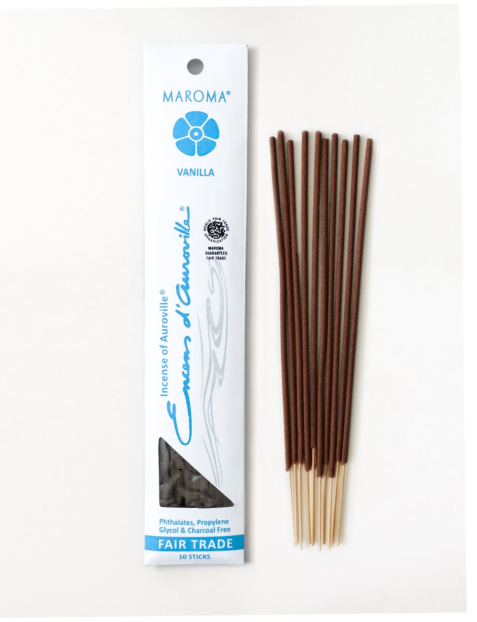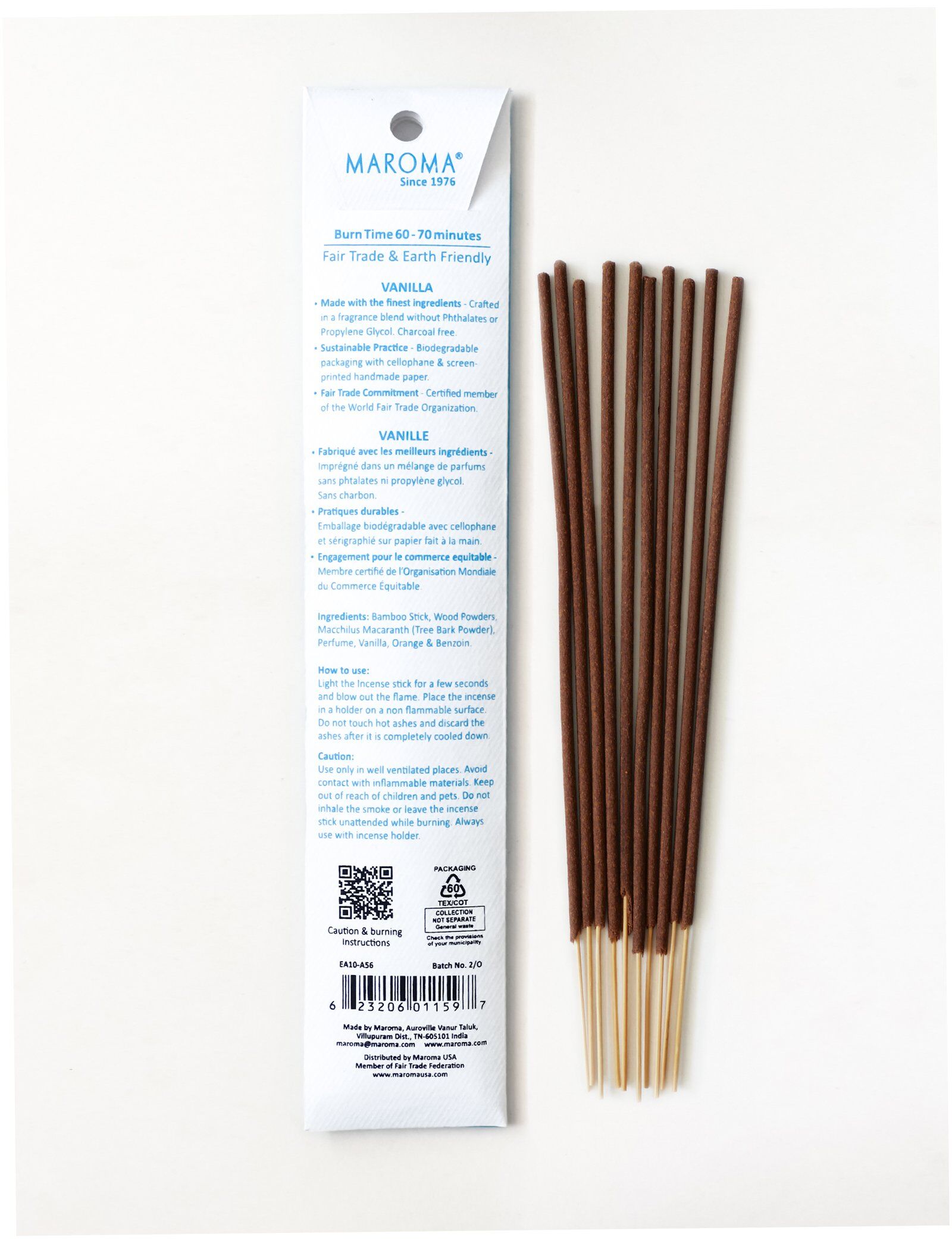- Pack of 10 incense sticks. A comforting blend of rich vanilla, brightened by zesty orange and deepened with the balsamic warmth of benzoin. This inviting fragrance fills your space with warmth and sweetness, creating a cozy, uplifting atmosphere. Hand-rolled with wood powder and natural gum resin for a clean, charcoal-free burn.