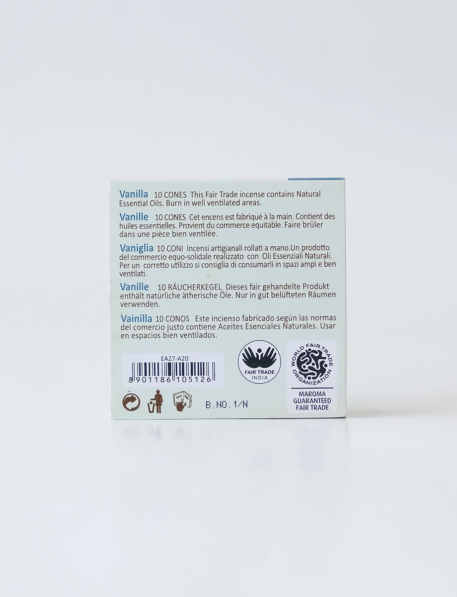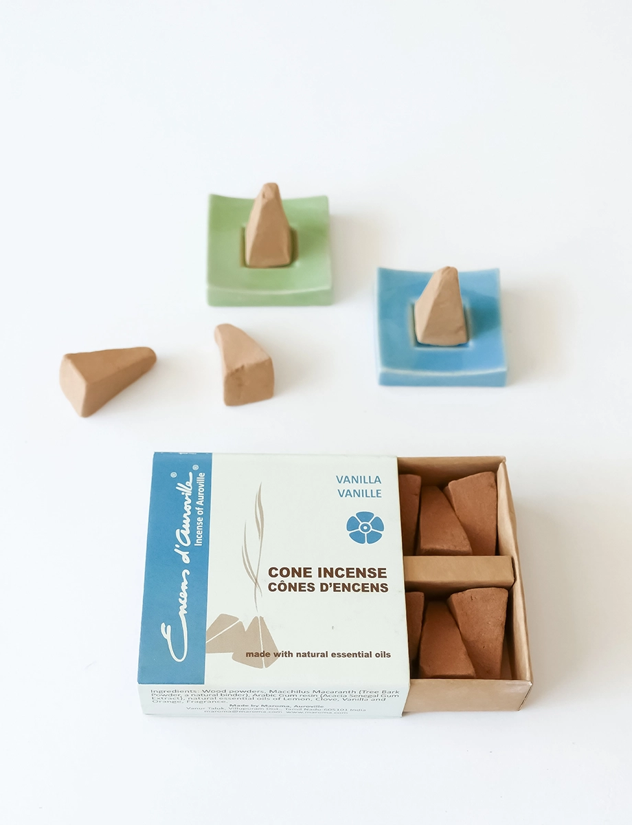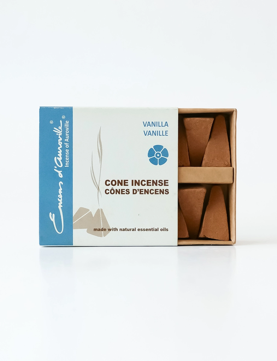 Pack of 10 incense cones. A cozy, uplifting blend of vanilla, lemon, clove, and orange. Its creamy and comforting aroma envelops your space, perfect for relaxation and creating a welcoming atmosphere.